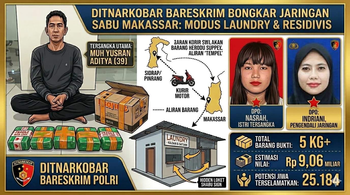 Makassar | BugisMakassar.Info – Direktorat Tindak Pidana Narkoba (Dittipidnarkoba) Bareskrim Polri berhasil menggagalkan peredaran narkotika jenis sabu skala besar di wilayah Makassar, Sulawesi Selatan. Dalam operasi tersebut, polisi membongkar modus operandi unik di mana pelaku menggunakan jasa laundry sebagai tameng untuk transaksi barang haram tersebut.