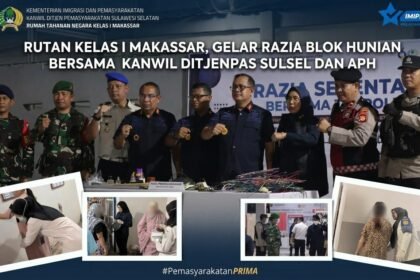 Makassar | BugisMakassar.Info + Dalam rangka memperingati Hari Bakti Pemasyarakatan (HBP) ke-62 Tahun 2026, Rumah Tahanan Negara (Rutan) Kelas I Makassar menggelar razia penggeledahan blok hunian pada Rabu (8/4). Tidak bergerak sendiri, Rutan Makassar menggandeng Kantor Wilayah Kemenimipas Sulawesi Selatan serta Aparat Penegak Hukum (APH) dari unsur TNI dan Polri. Kegiatan ini dipantau langsung oleh...